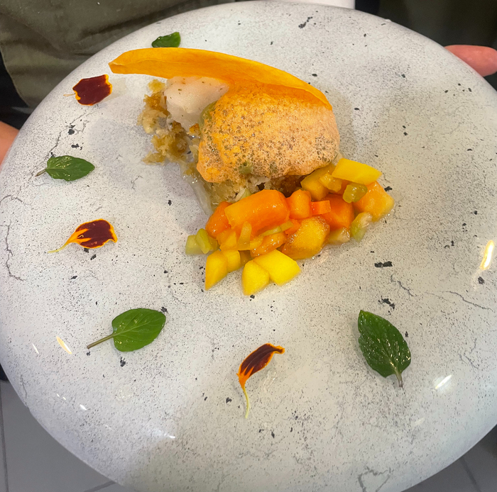 - Place the lemon and mint sorbet on the other side of the plate.Garnish with a slice of glazed pumpkin.