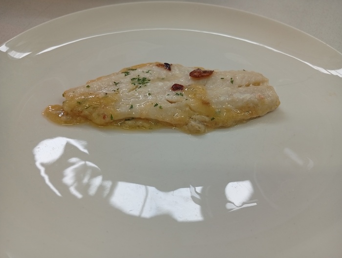 - Meter al horno 180 ºC hasta que el pescado esté hecho, espolvorear con perejil en brunoise.