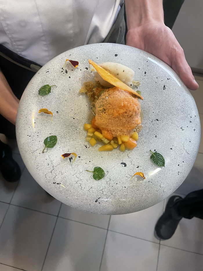 - Colocar el sorbete de limón con menta en el otro lado del plato.