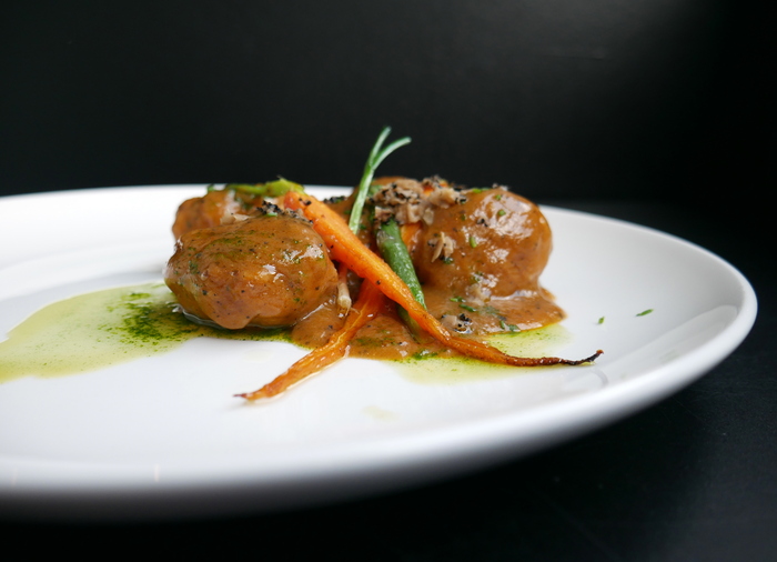 Lumagorri oilasko almondrongiloak boilurra eta foierekin (Tapa)